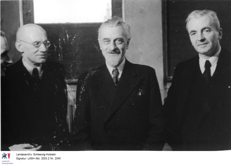 2. Kabinett Steltzer: rechts Ministerpräsident Theodor Steltzer (CDU), Innenminister Hermann Lüdemann (SPD), Mitte. links Wilhelm Kuklinski (SPD), 2. Dezember 1946