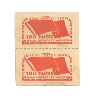 [[Datei:Sondermarke SPD 100 Jahre Kommunistisches Manifest.jpeg|mini|Sondermarke der SPD Kiel 100 Jahre Kommunistisches Manifest]] | |||