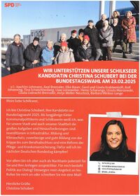 Ansichtskarte mit Werbung für die Kieler Kandidatin zur Bundestagswahl 2025 von Mitgliedern des Ortsvereins Schilksee