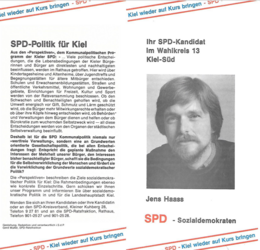 Jens Haass, * 20. Dezember 1948 in Kiel; † 11. Dezember 2013 in Kiel; Dipl.-Wirtschaftsingenieur, verheirat, 2 Kinder. Mitglied der SPD.