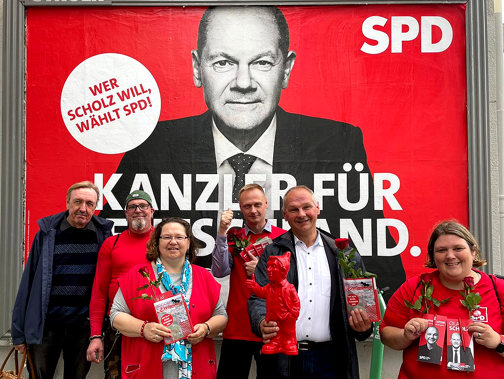 Mitglieder und Unterstützer des [[Ortsvereins Kiel-Süd]] vor einem Wahlplakat zur [[Bundestagswahl 2021]] im Stadtteil während der traditionellen Rosenverteilung an Wählerinnen und Wähler am Vortag der Wahl, dem [[25. September]] [[2021]]. | Mitglieder und Unterstützer des [[Ortsverein Kiel-Süd|Ortsvereins Kiel-Süd]] vor einem Wahlplakat zur [[Bundestagswahl 2021]] im Stadtteil während der traditionellen Rosenverteilung an Wählerinnen und Wähler am Vortag der Wahl, dem [[25. September]] [[2021]]. | ||
