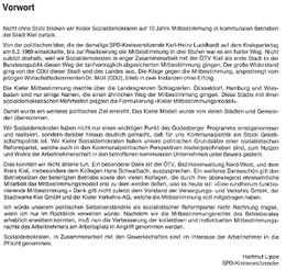 [[Datei:10 Jahre Mitbestimmung in Kiel Vorwort.jpg|260px|thumb|left|Vorwort des SPD Kreisvorsitzenden Hartmut Lippe in der Broschüre ]]10 Jahre Mitbestimmung in Kiel, 1980 | |||