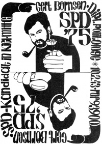 Der „Börnsen-Bube“ mit dem Aufdruck 'SPD '75' wird von den Kieler Jungsozialisten im Handdruck hergestellt und auch als Autoaufkleber angeboten. Handsigniert von Willy Brandt und Herbert Wehner will Gert Börnsen sein Poster demnächst auf einer Ausstellung von „Politischer Grafik“ versteigern. Er erhofft sich daraus eine gut Stabilisierung seiner Wahlkampfkasse."[1]