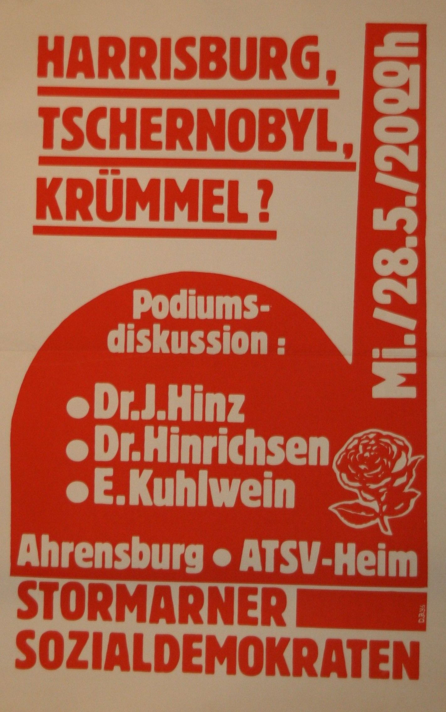 Einladung zur Podiumsdiskussion über Atomkraft. == Aufschrift == Harrisburg, Tschernobyl, Krümmel? Podiumsdiskussion: * Dr. J Hinz * Dr. Hinrichsen * E. Kuglwein Ahrensburg, ATSV-Heim [[Kreisverband Stormarn|S… |