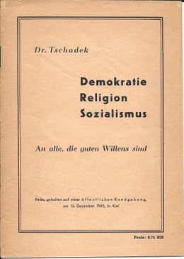 Dr. Otto Tschadek, * 31. Oktober 1904 Trautmannsdorf, Niederösterreich, † 4. Februar 1969 in Wien; österreichischer Rechtsanwalt. Mitglied der SDAPDÖ, der Sozialdemokratischen Partei Deutschösterreichs, der SPD und der SPÖ, der Sozialdemokratischen Partei Österreichs. Ab 1940 diente er bei der deutschen Kriegsmarine, zuletzt war er Oberstabsrichter am Marinegericht Kiel. 1945 war Otto Tschadek an der Wiedergründung der Kieler SPD beteiligt.