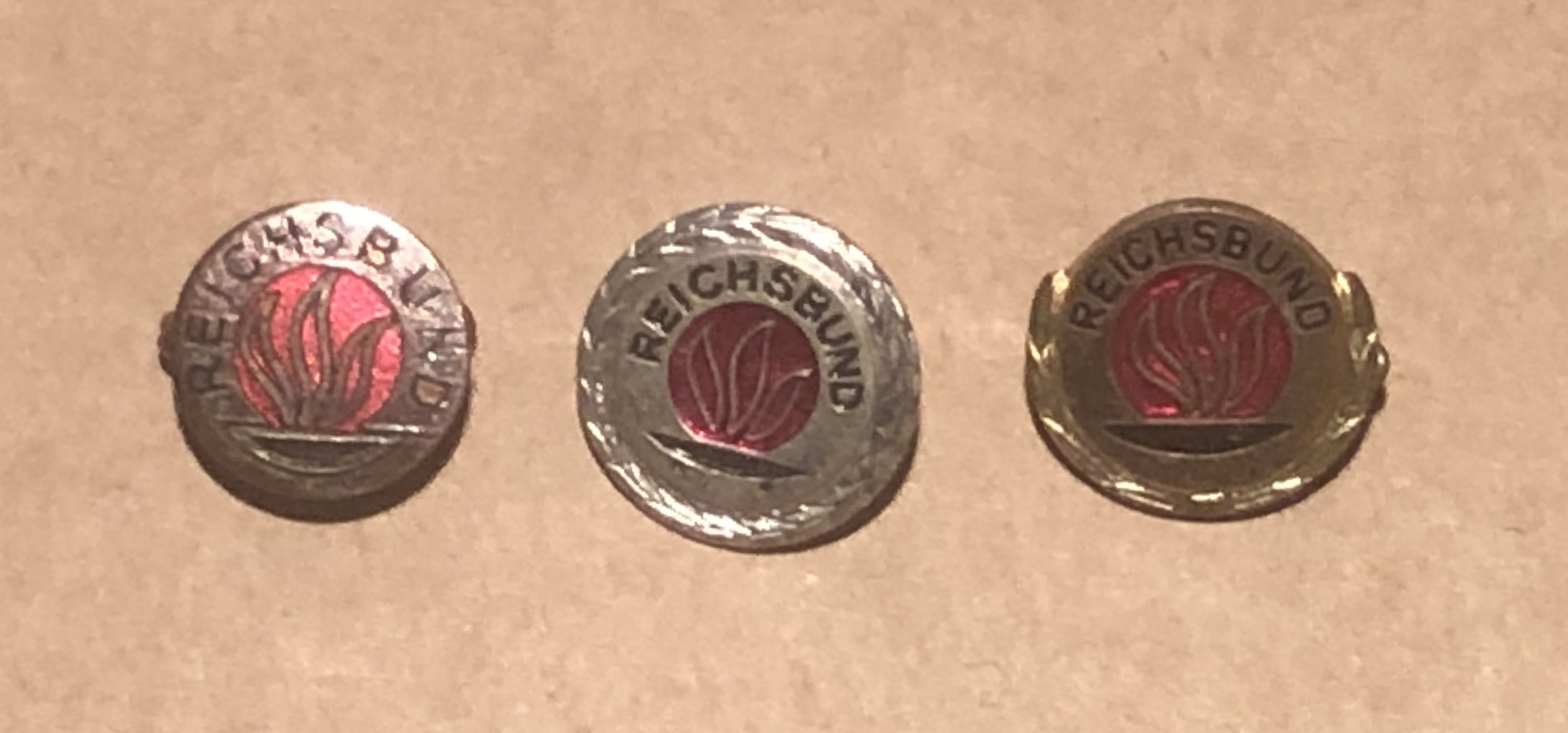 | 18:01, 16. Feb. 2024 | Anstecker Reichsbund.jpg (Datei) | 514 KB | Drei Anstecker des Reichsbunds, ein einfacher, einer mit silbernem und einer mit goldenem Ehrenkranz. Vermutlich aus den 1950-ger Jahren. 1999 wählte der Verband den neuen Namen Sozialverband Deutschland (SoVD) mit dem Zusatz ehemals Reichsbund, gegründet 1917. Anstecker aus der Sammlung von Karl Altewolf Foto: Bernd Löwner | 1 | |