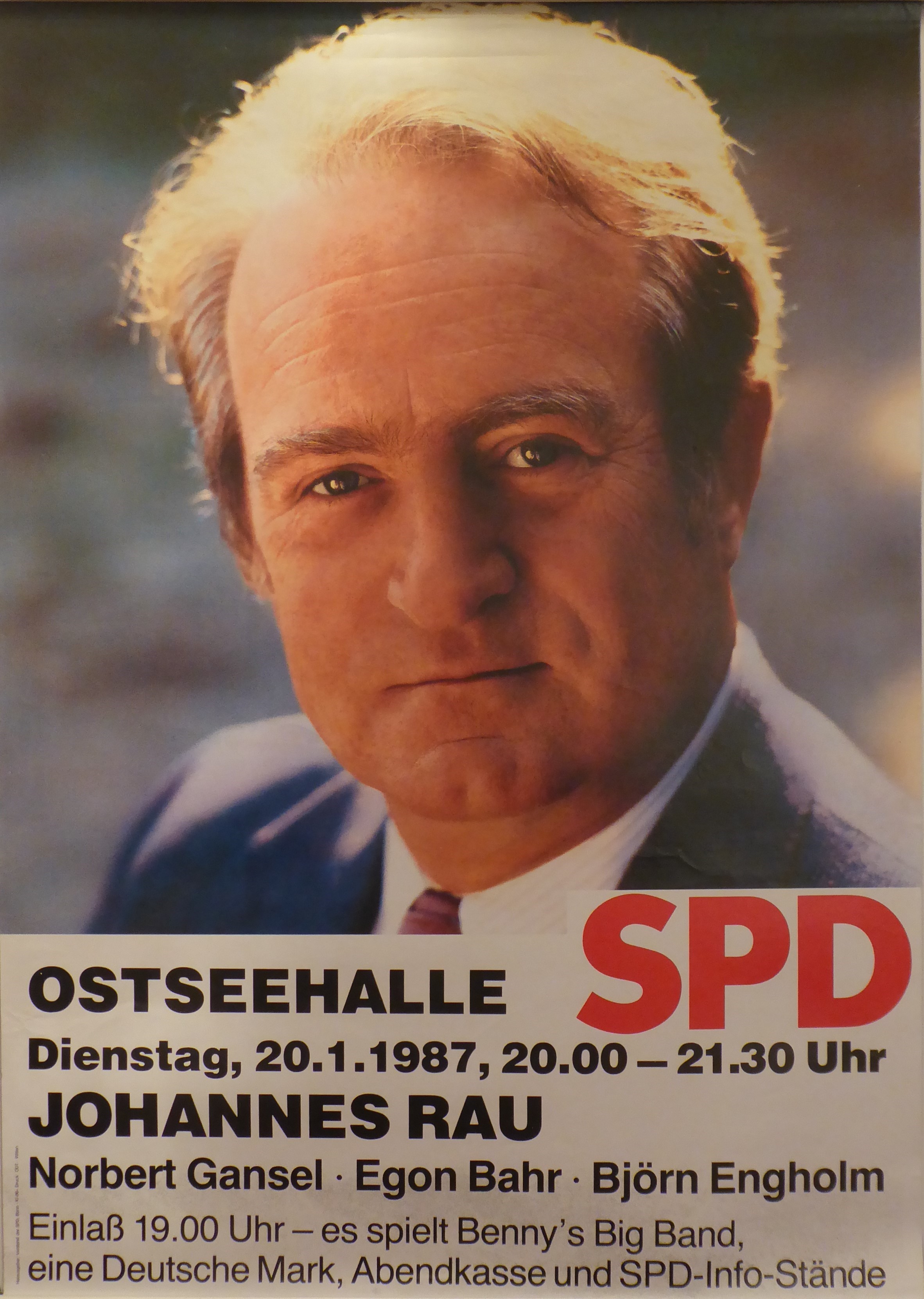 | 18:20, 29. Dez. 2023 | Johannes Rau Kanzlerkandidat BTW 1987.JPG (Datei) | 1,05 MB | Plakat füe eine Veranstaltung mit dem damaligen Ministerpräsidenten von Nordrhein Westfalen und Kanzlerkandidaten zur Bundestgswahl 1987 der SPD Johannes Rau. Sammlung: Bernd Löwner | 1 |