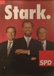 | 18:26, 29. Dez. 2023 | Schröder Scharping Lafontaine BTW 1994.JPG (Datei) | 828 KB | Plakat aus dem Bundestagswahlkampf 1987. Dem Spitzenkandidaten Rudolf Scharping wurden die Ministerpräsidenten Gerhard Schröder und Oskar Lafontaine zur Unterstützung zur Seite gestellt. Sammlung: Bernd Löwner | 1 | |