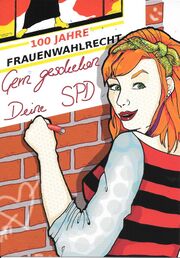 | 13:04, 11. Sep. 2024 | Postkarte 100 Jahre Frauenwahlrecht.jpeg (Datei) | 760 KB | BeLö | Postkarte 100 Jahre Frauenwahlrecht, Herausgegeben von der Arbeitsgemeinschaft sozialdemokratischer Frauen (ASF). Die Karte erinnert daran, dass das Frauenwahlrecht der SPD zu verdanken ist. Scan: Bernd Löwner | 1 | |