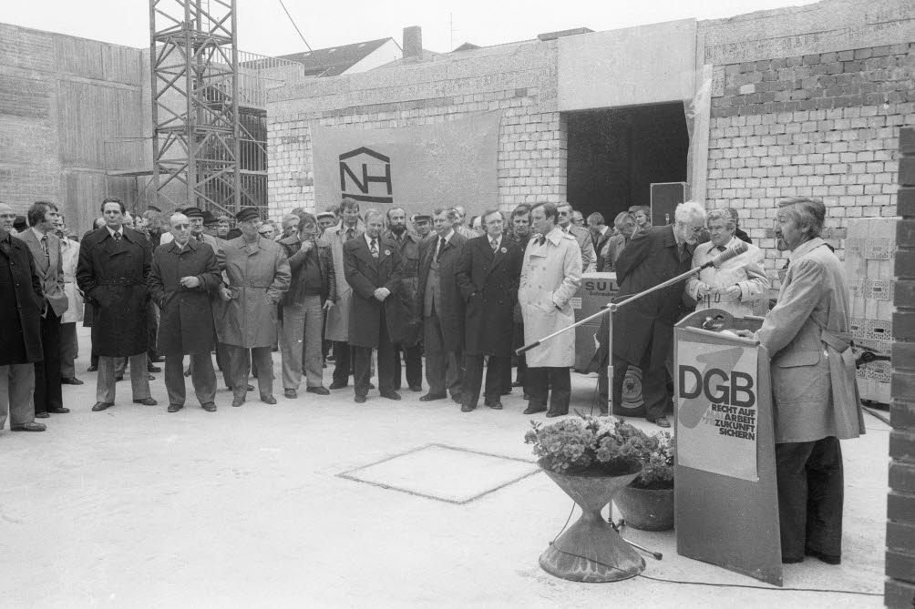 Beschreibung: Richtfest für den Erweiterungsbau des Gewerkschaftshauses im Hof nach der Zerstörung durch den Großbrand im April 1975. Im Bild u.a. der ehemalige Kreisvorsitzende des DGB Kiel-Plön Willi Kuster (4.v.l.).