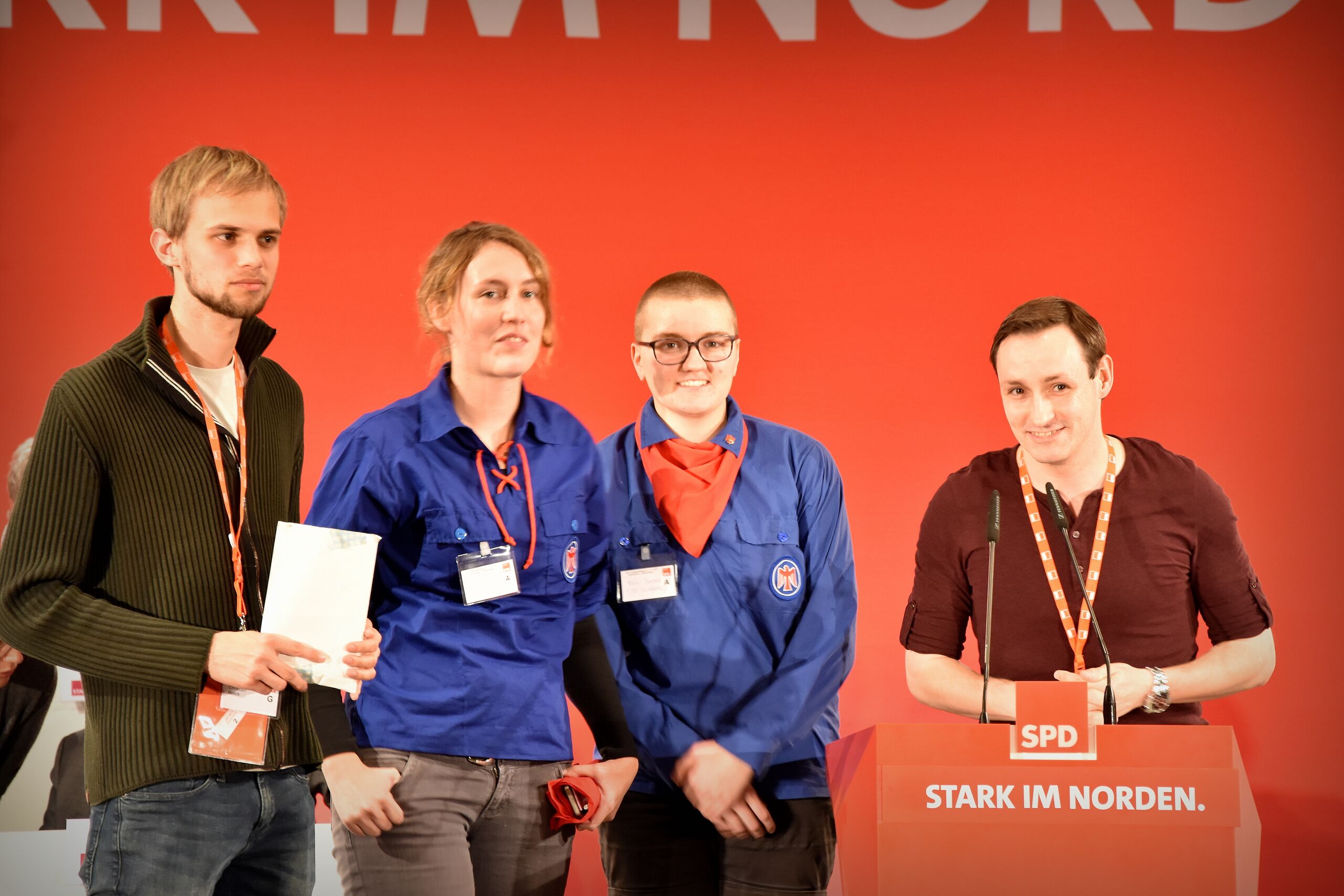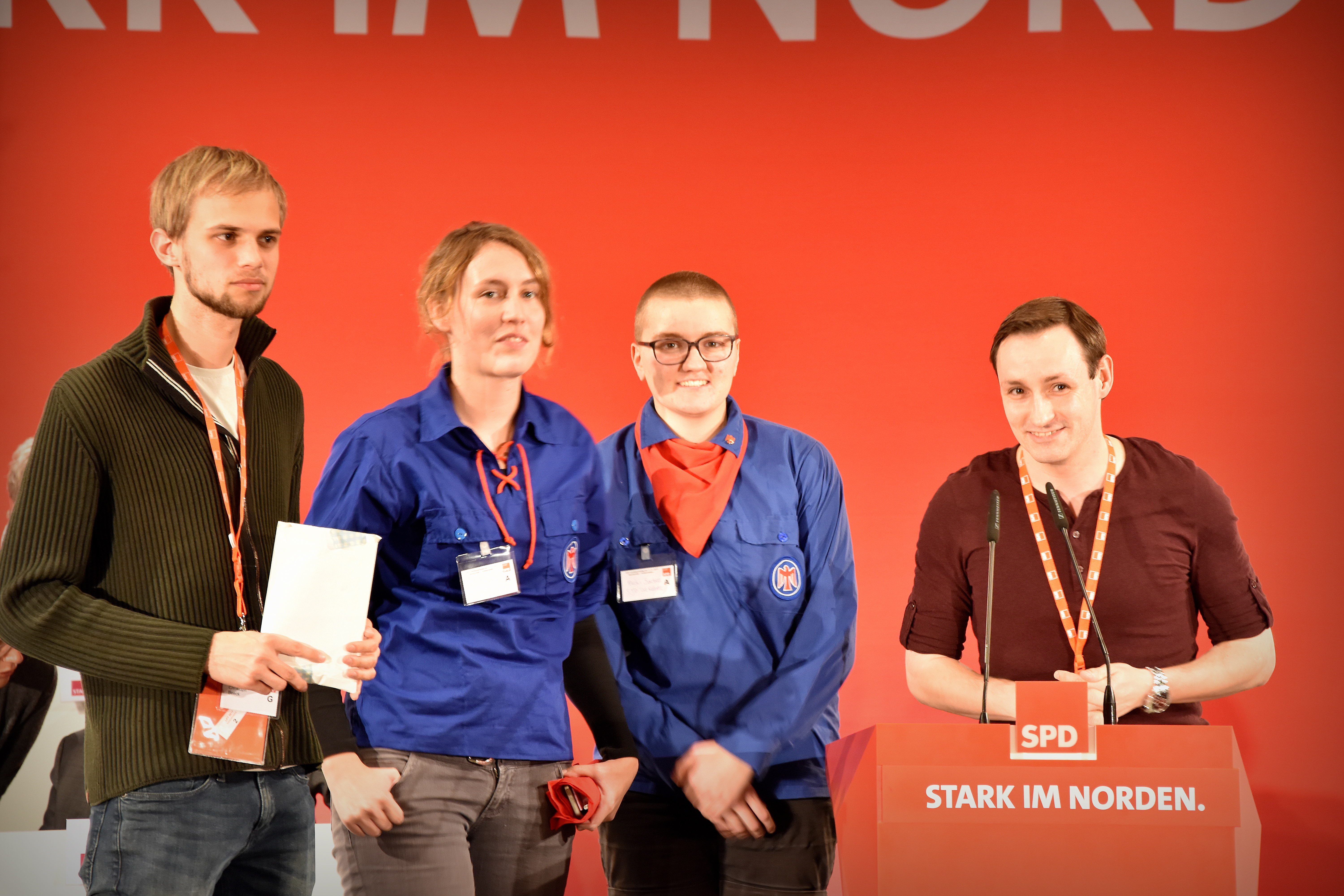 Alexander Wagner (am Redepult) und Christoph Beeck (ganz links) überreichen den Erlös des Sondermarkenverkaufs auf dem Landesparteitag 2017, Neumünster