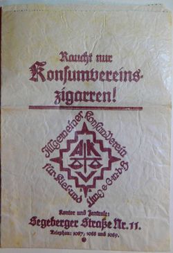 Das Eigentum des Konsum beschränkte sich nicht auf das Hauptgelände. Ein Teil der Grundstücke und Häuser, in denen Verteilungsstellen eingerichtet waren, gehörte ihm ebenfalls; die Wohnungen wurden an Mitglieder vermietet.[17] So sorgte die Genossenschaft ganz nebenbei für bezahlbare Mieten. Rosa Wallbaum gibt die Höhe des Genossenschaftsanteils etwa 1924 mit 40 Mark an; später seien für "neue Bauvorhaben und Grundstückskäufe" 10 Mark nachgefordert worden.[18] Dies wurde offenbar akzeptiert.