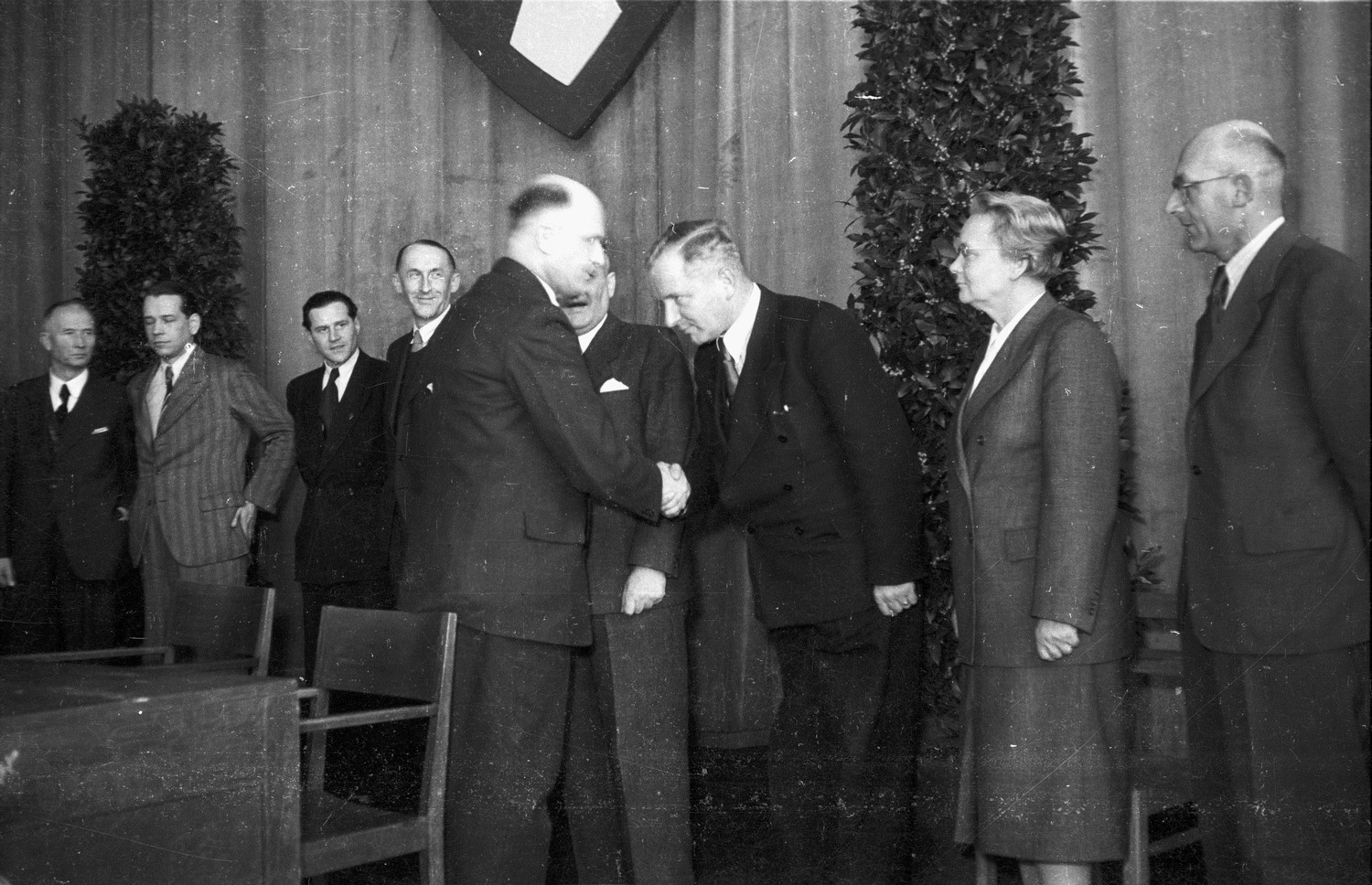 Stadtpräsident Peter Jeschke verpflichtet Oberbürgermeister Andreas Gayk und weitere Magistratsmitglieder. Ratssitzung vom 20. April 1950 in der Pädagogischen Hochschule, Fröbelstr. 15-17. Stadtpräsident Jeschke (vorn links) verpflichtet die neu gewählzen Dezernentinnen und Dezernenten: (v.r.) Stadtrat Friedrich Mandelkow, Stadtschulrätin Toni Jensen, Oberbürgermeister Gayk (verdeckt) sowie die ehrenamtlichen Stadträte Hermann Hartmann, Hermann Köster, Herbert Sartori und Herrn ?. Datierung: 20.04.1950 Fotograf: Friedrich Magnussen Stadtarchiv Kiel, Signatur 19.438