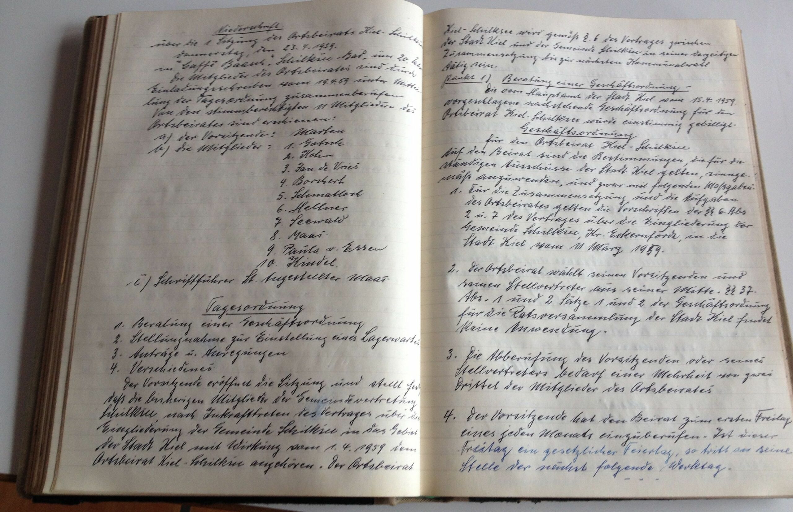 Protokollbuch des Ortsbeirats Kiel-Schilksee von 1959, erst 2018 wieder aufgefunden im Ortsverein Schilksee. Foto Gesine Stück