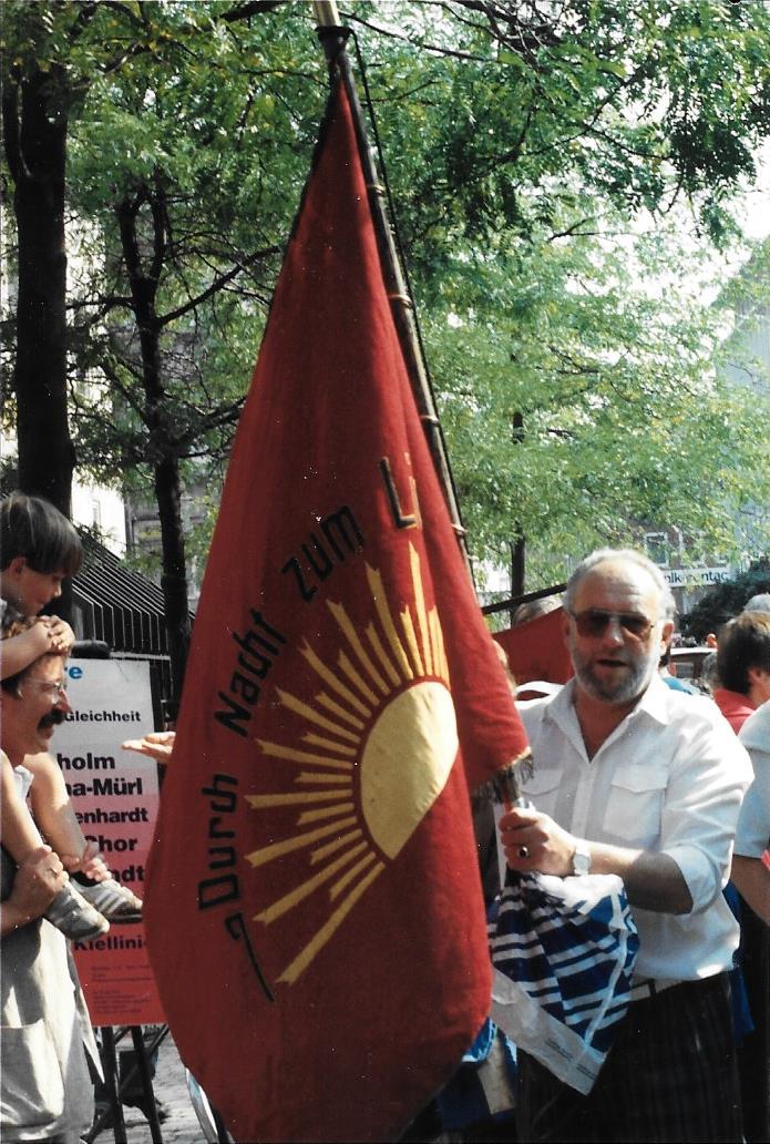 Wolfgang Herrmann, SPD, als Fahnenträger bei der Festveranstaltung 125 Jahre SPD Schleswig-Holstein am 10. September 1988 in Kiel.