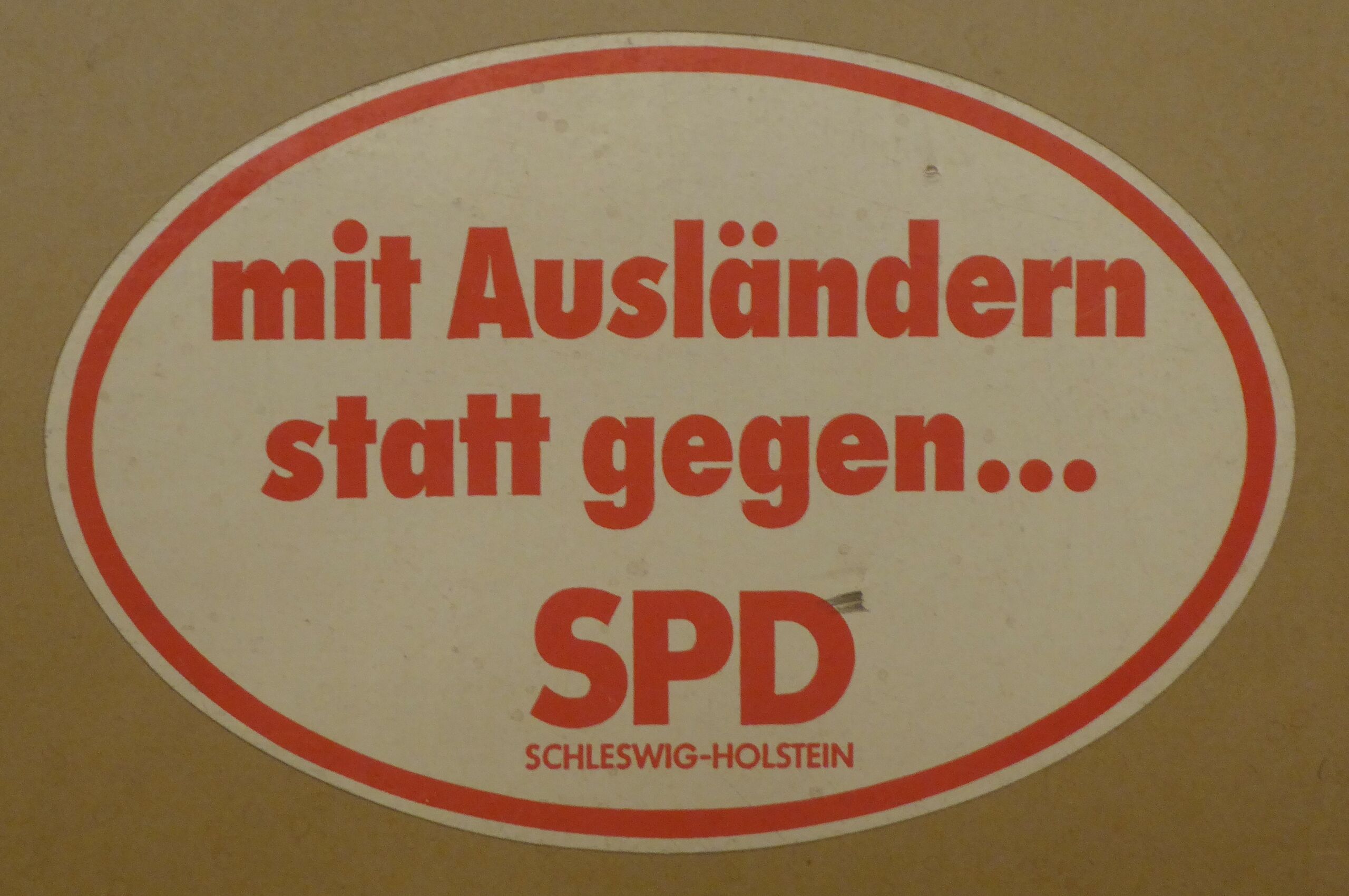 Aufkleber mit Ausländern statt gegen... SPD, undatiert, vermutlich aus den 1990-iger Jahren.