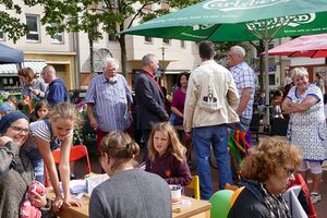 Bruno Levtzow in seinem Stadtteil, hier 2017 auf dem Brunnenfest mit Mathias Stein (blaue Jacke) und Rudi Jungnickel (rechts unterm Schirm)