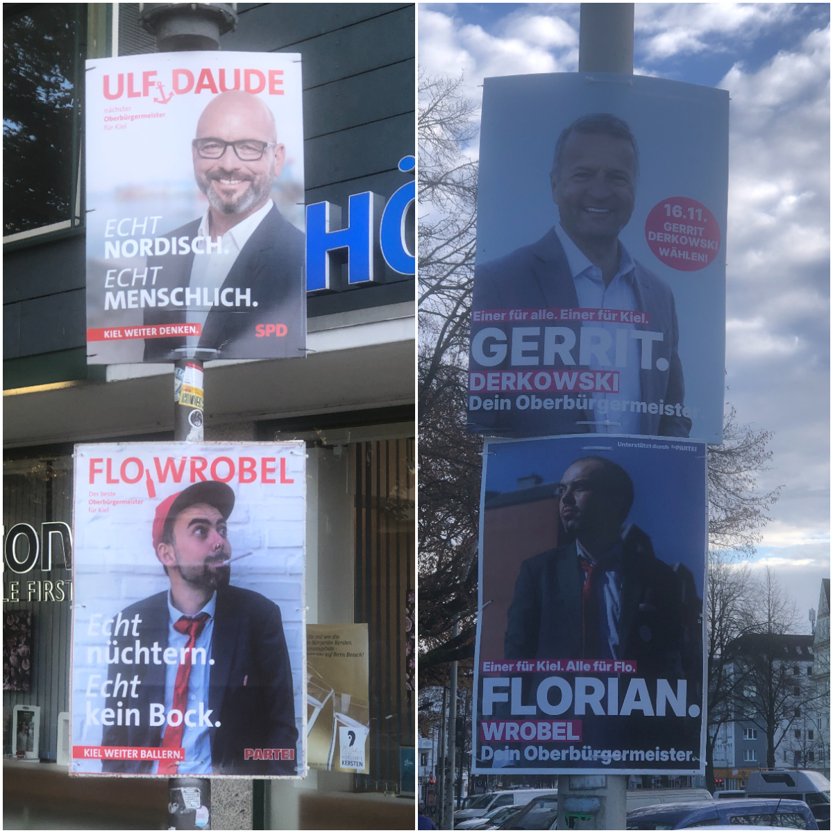 Wahlplakate von Ulf Daude, Gerrit Derkowski und Florian Wrobel aus dem OB-Wahlkampf im November 2025 in Kiel. Florian Wrobel karikierte die Plakate von Daude und Derkowski. Fotos: Bernd Löwner