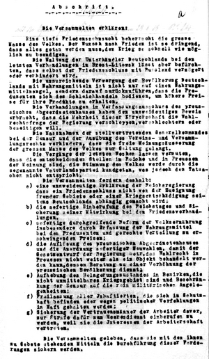Damit war der Januarstreik ein Vorbote der Novemberrevolution - die späteren Arbeiter- und Soldatenräte bauten direkt auf diesen Erfahrungen auf. Für einen echt durchschlagenden Erfolg fehlte dem Streik jedoch nicht nur der breite Rückhalt in der Arbeiterschaft, sondern vor allem die bewaffneten Soldaten und Matrosen.[2] Den sollte es erst im November beim Kieler Arbeiter- und Matrosenaufstand geben. Der verfügte über die Kraft, die zur Novemberrevolution und dem Ende von Krieg und Kaiserreich führte.