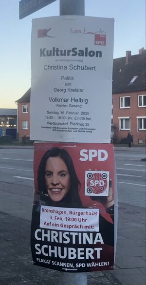 Eine Scheune neben der Gaststätte "Suchsdorfer Hof" am Sukoring beherbergte zu Wahlkampfzeiten das Plakatlager des Kreisverbandes, wo auch die Träger geklebt wurden. Aus dem Ortsverein dabei waren in den 1960ern u.a. die Jusos Heinz Dammers, Claus Möller und Jürgen Baade. Letzterer hatte ein Haus am Wiesenhof, in dem nach getaner Arbeit gerne noch ein Abschlussbier getrunken wurde.[24]